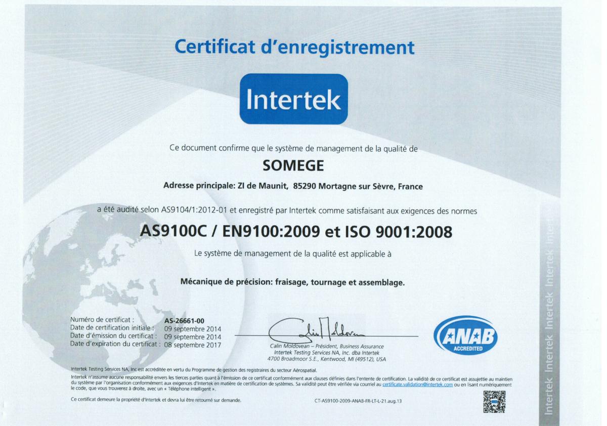 SOMEGE’s quality system was certified in 1991 and conforms to international standards ISO9001: 2008 and EN9100: 2009 for "Precision mechanics: milling, turning and assembly".